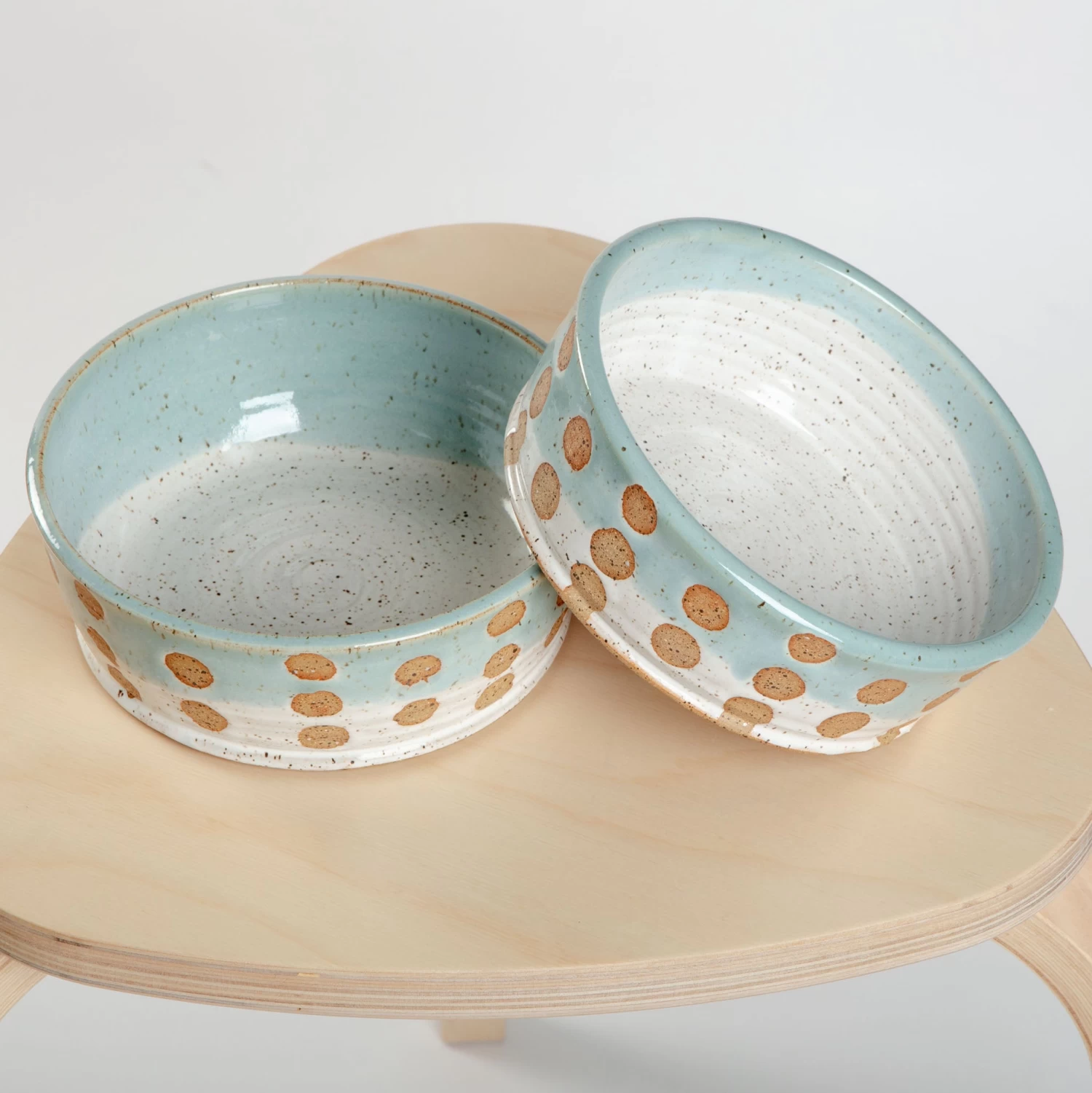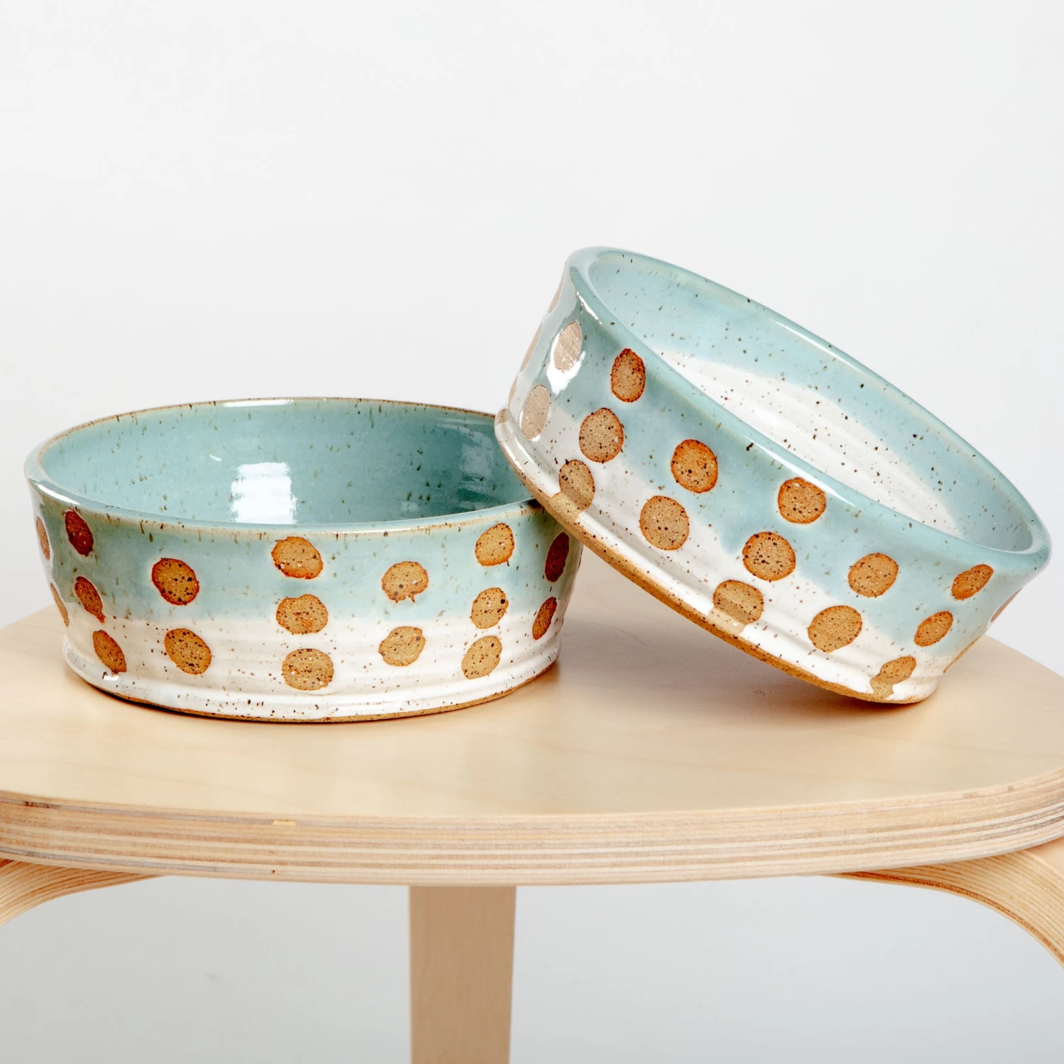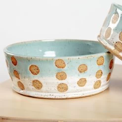 These unique bowls by BARI MOSS are thrown on a potter’s wheel in a speckled clay body. After they’re fired once (bisque fired), they are ready to be glazed. Then the finished product!