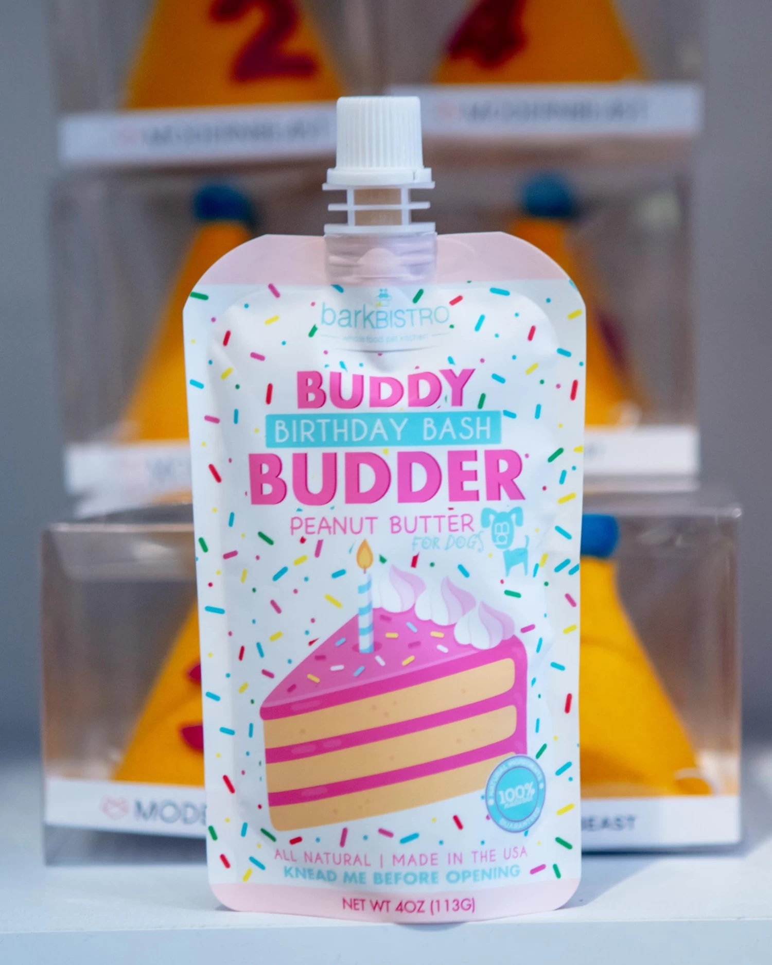 These yummy peanut butter squeeze packs by BARK BISTRO are perfect for training, traveling, and lick mats for keeping pups busy!