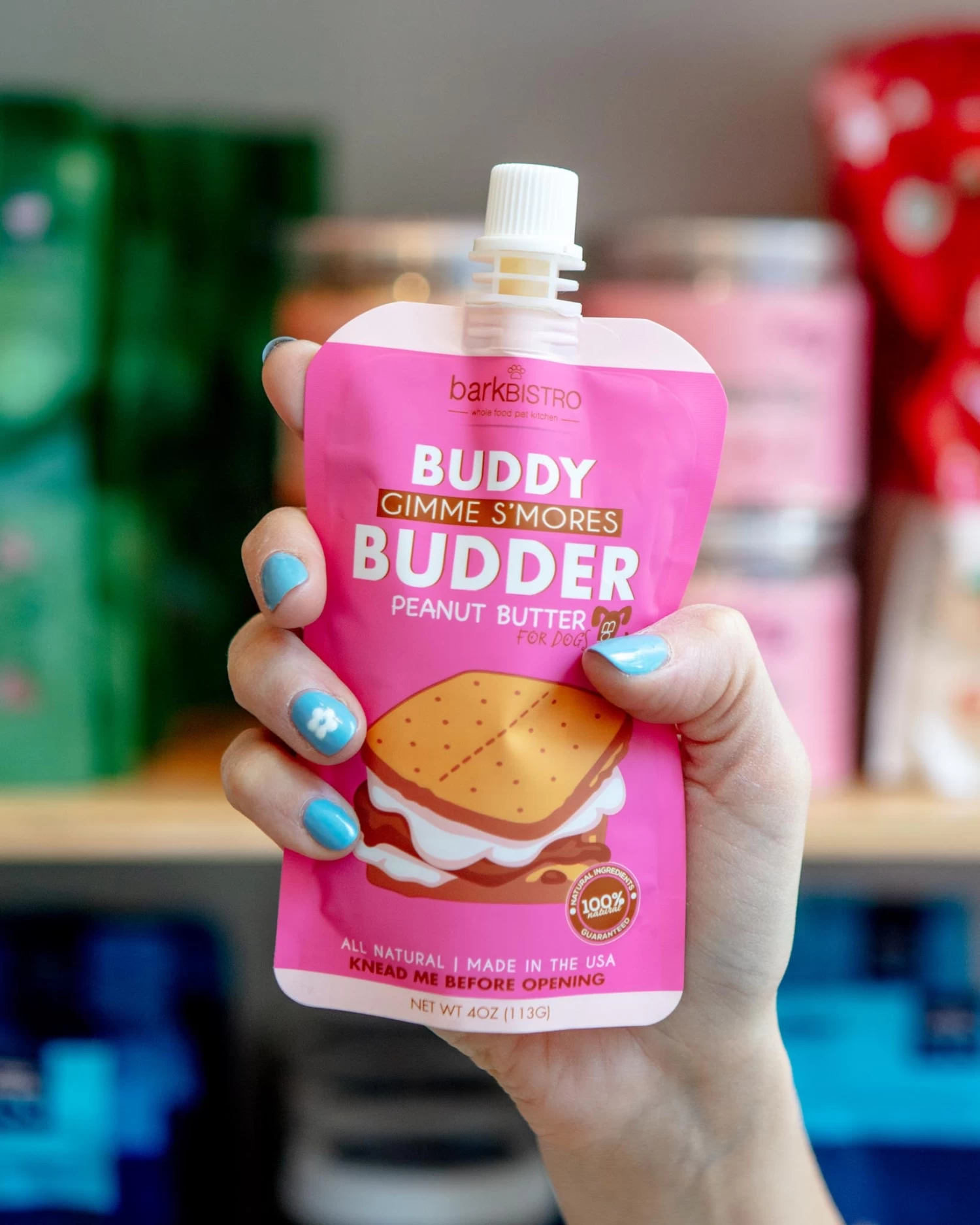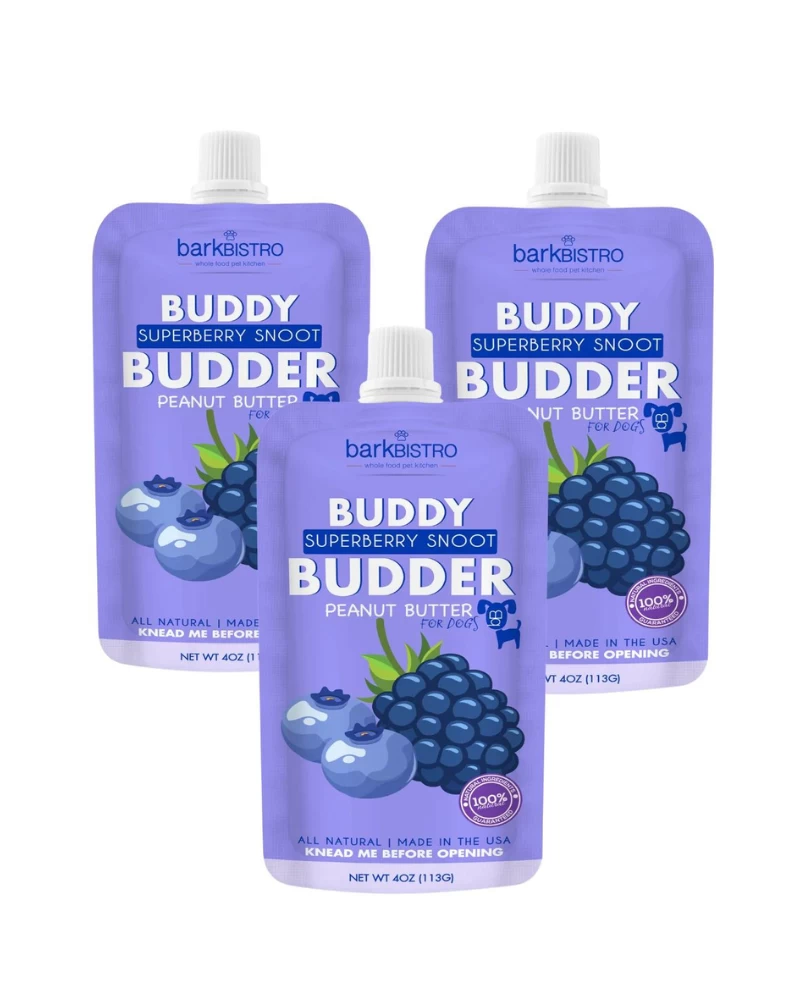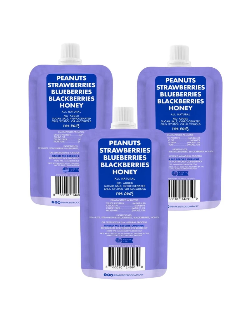 These yummy peanut butter squeeze packs by BARK BISTRO are perfect for training, traveling, and lick mats for keeping pups busy!