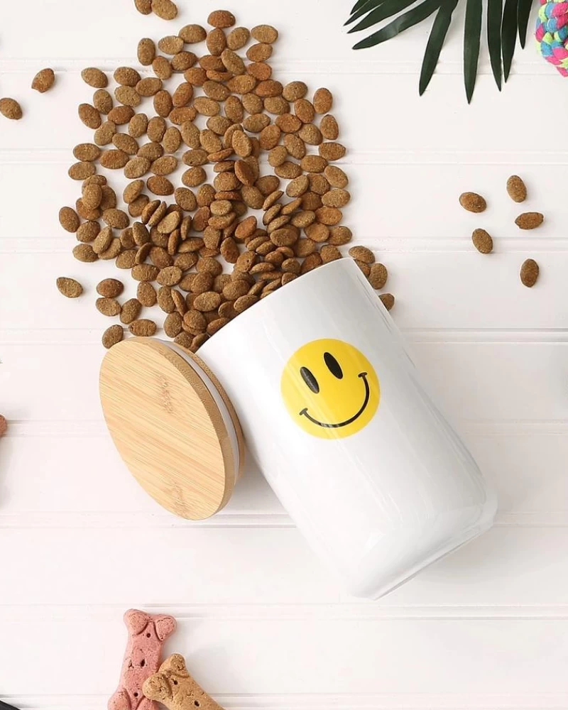 This happy, yappy treat canister measures 4 inches in diameter by 6.5 inches in height, perfect for storing pet food, treats for dogs and cats.