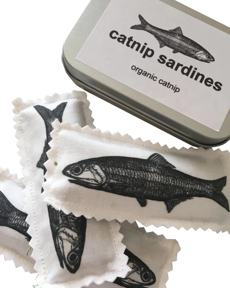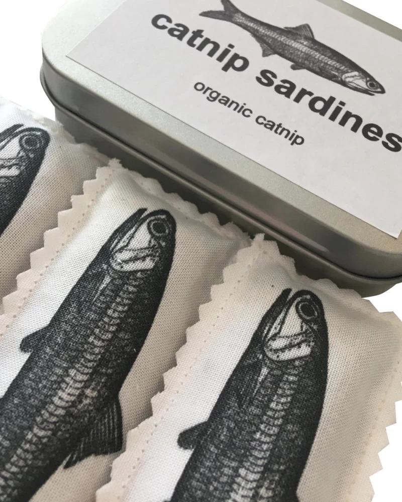 Organic catnip stuffed sardines with USA organically grown catnip. Natural linen cotton canvas printed with pet safe inks in the USA.