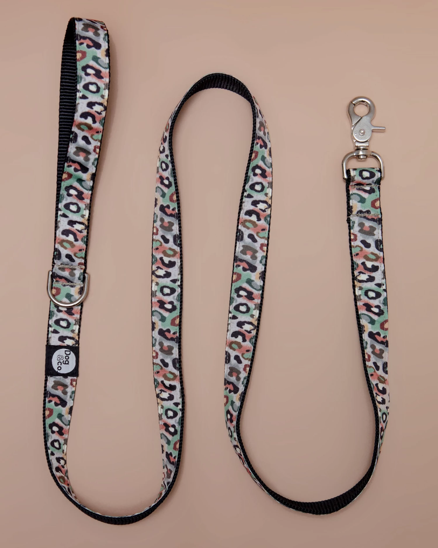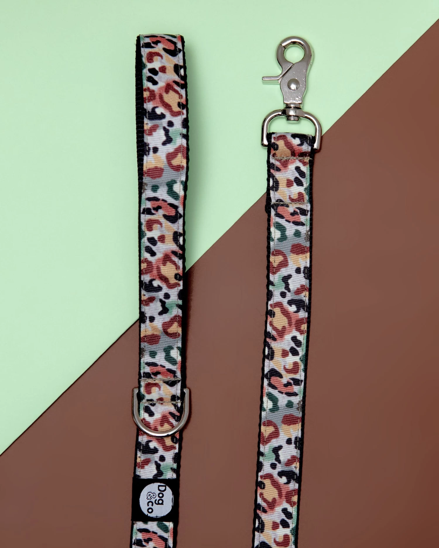A hip hybrid of camo + leopard prints are backed by chic, durable black webbed nylon for a cool, long-lasting combo. Silver clip hardware and an added silver d-ring make this one easy to attach a pup AND a poop-bag holder.