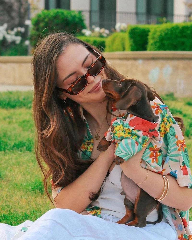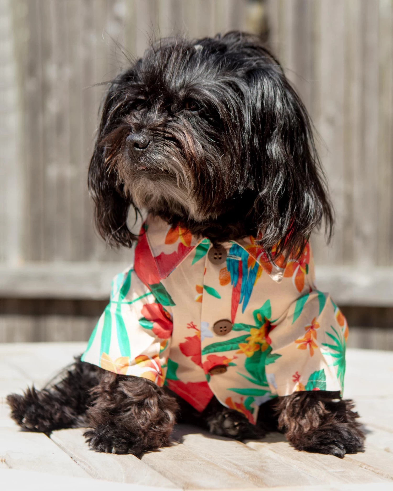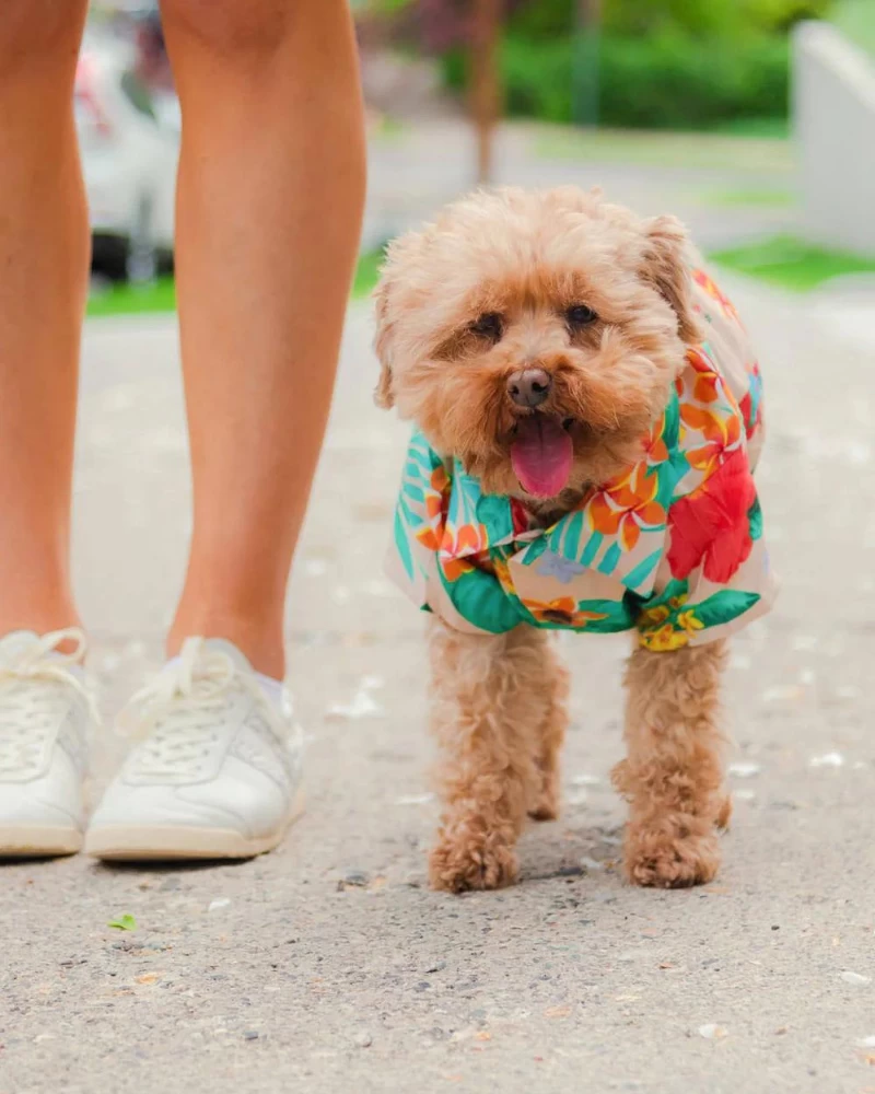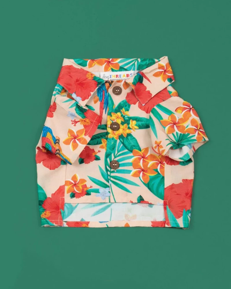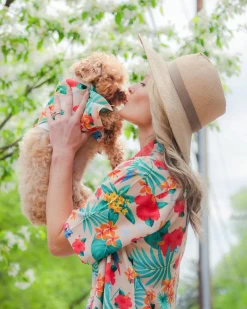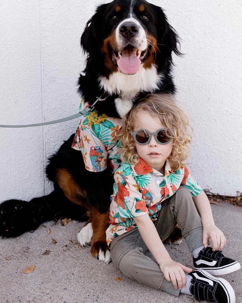 Celebrate your special bond with this colorful matching set by Dog Threads. Made from a lightweight fabric featuring a vibrant tropical print, perfect for your next party.