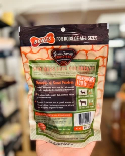 GAINES FAMILY FARMSTEAD takes extra pride in the production of their Sweet Potato Bones, cooking them for just the right amount of time, which ensures they have just the right amount of chewiness, while also ensuring your dog still gets the vitamins and nutrients that all sweet potatoes contain naturally!