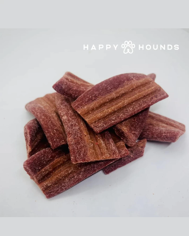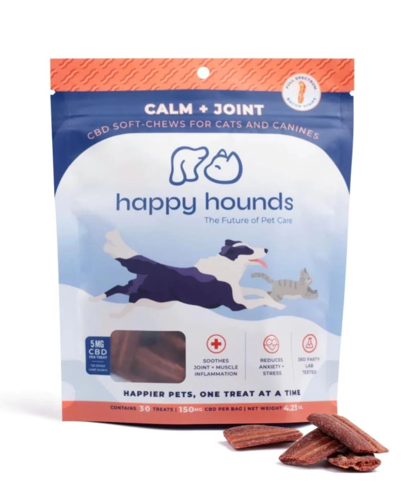 The Calm + Joint Bacon Strips by HAPPY HOUNDS contains 5mg of lab-tested premium CBD proven to improve mood and mobility in our four-legged family members.