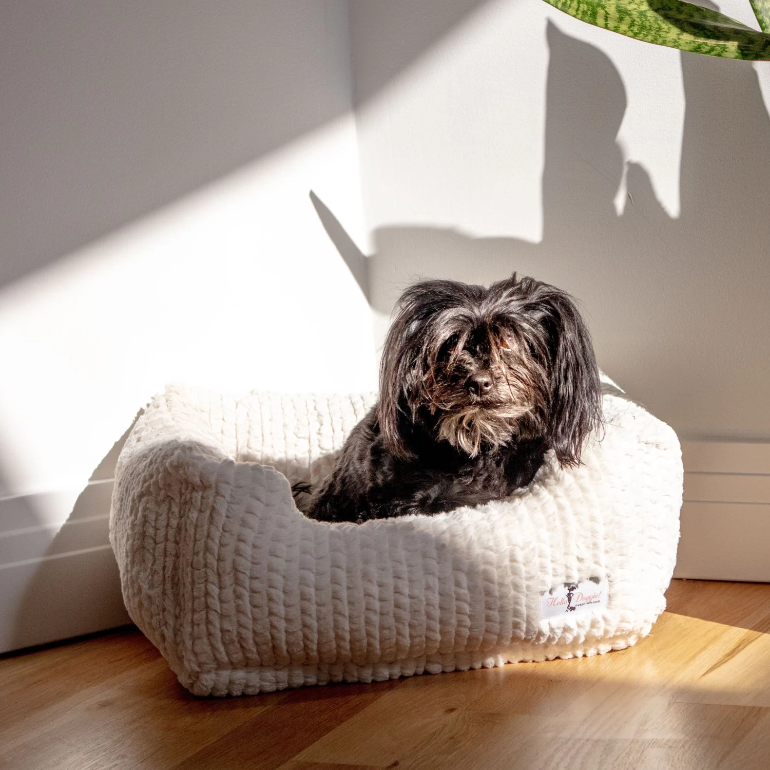 The Paris bed is made with luxurious, soft-cuddle fabric stuffed with 100% poly-fiber fill. It is easy to care for machine wash on a gentle cycle, no bleach or fabric softener, dry on low heat or air dry for brand new look every time.