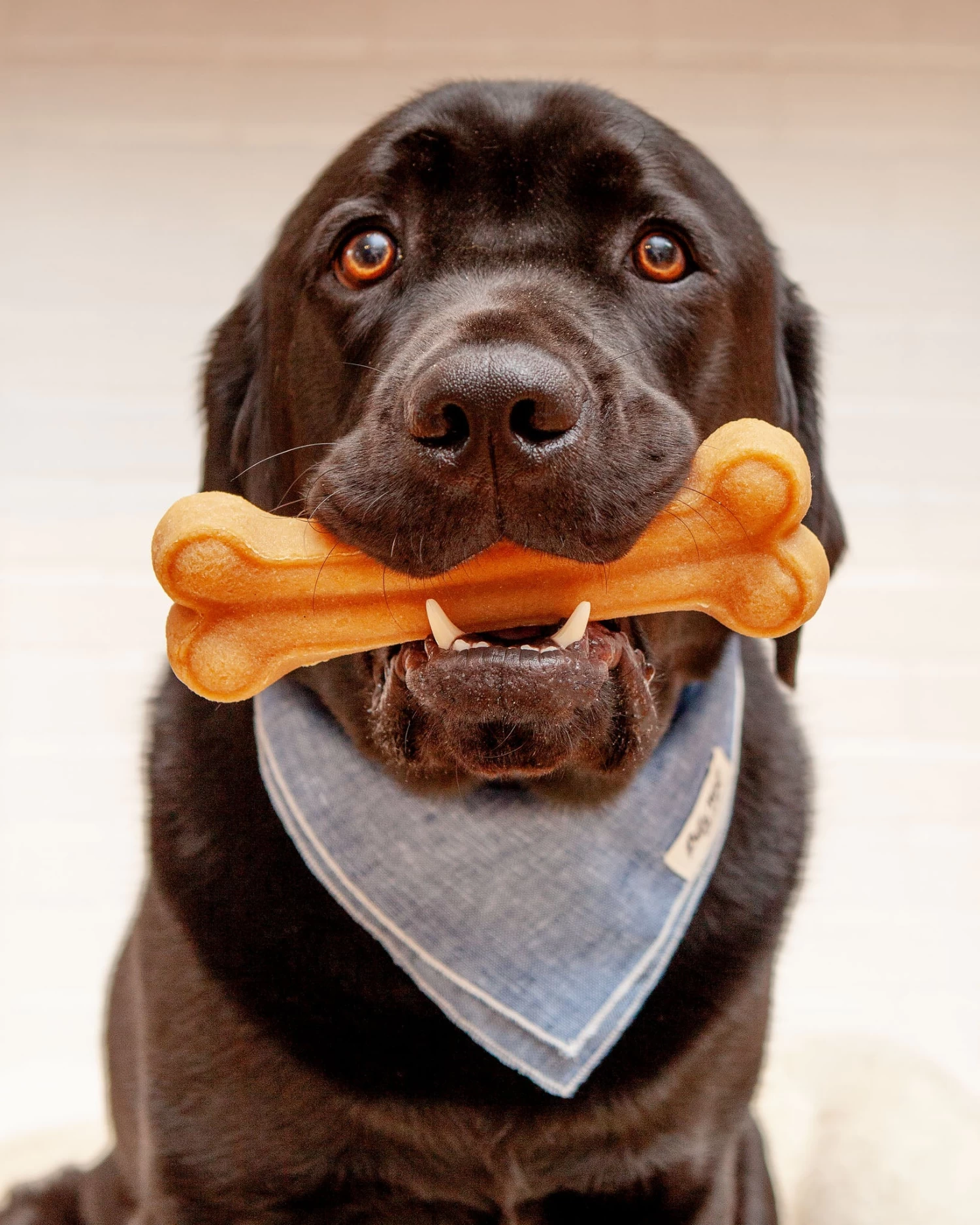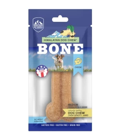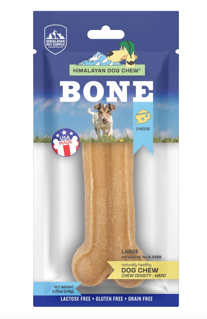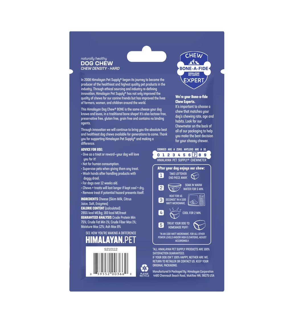 Himalayan Dog Chew Bone is a hard, smoked cheese chew. It is hand-pressed into a bone shape mold using our same traditional ancient recipe from the Himalayas. It is slightly less dense than original hard cheese chews, measuring a 7 on the Chewmeter®. It is a long-lasting; dogs must work the end of the treat for hours, softening it with their mouths before small parts of it can be slowly chewed off. The bone shape provides a stable bottom to the chew making it easily accessible to dogs of all ages; puppies to seniors. When you give this treat to your dog, you know that you are providing them with high-quality eating entertainment.