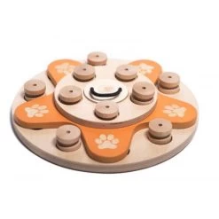 The game consists of a round pedestal and two movable platforms. The top platform holds removable cylinders, while the middle platform is in the shape of a flower with five cut-out “petals” covering openings in which treats can be hidden. The top platform can be turned independently of the middle platform and contains five cylinders under which treats can also be hidden. Your dog can reach these by removing the cylinders.