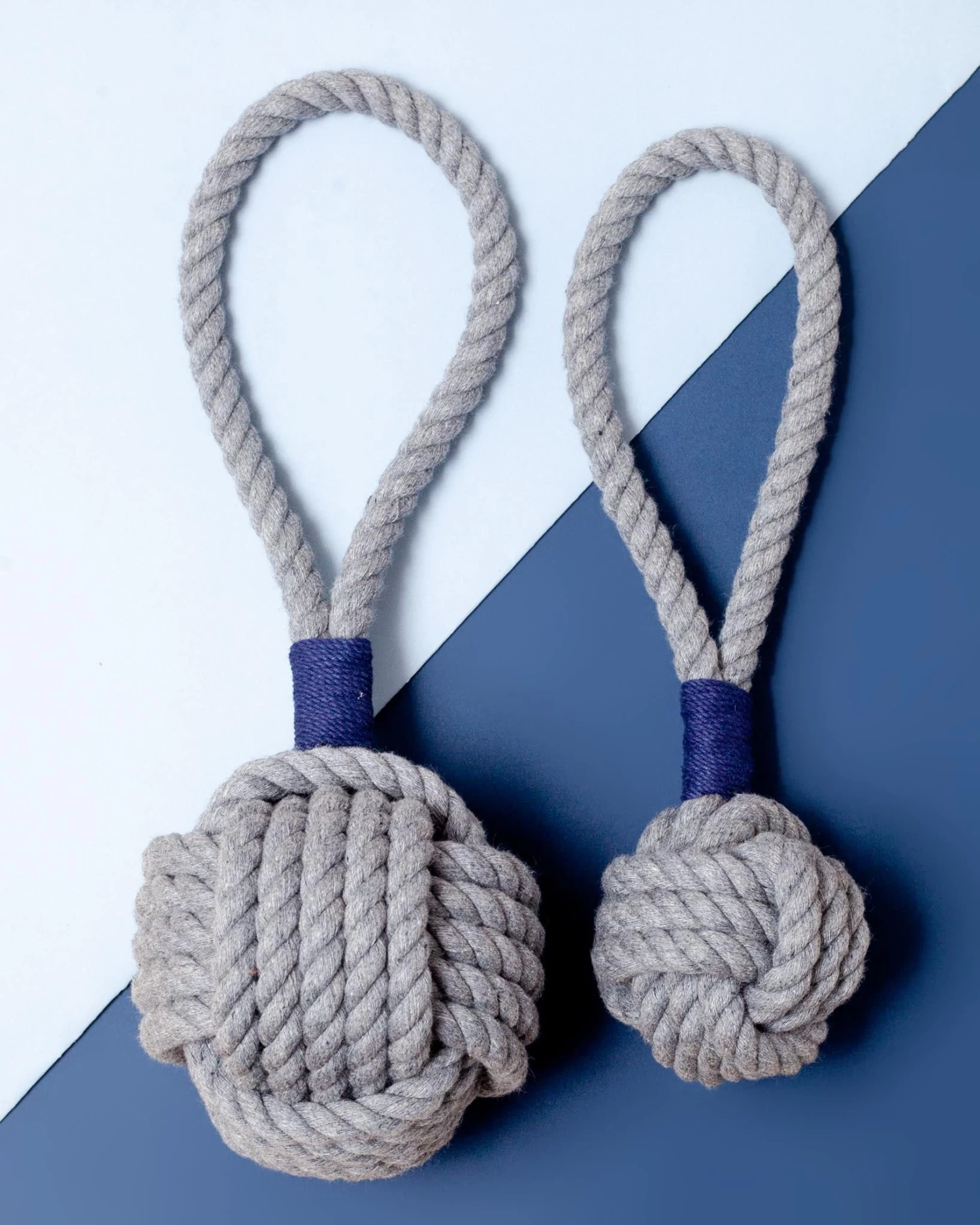The large monkey fist dog toy is 4″ acroos and is tied around a tennis ball. If your dog loves to swim, it will float! For smaller dogs, we have the smaller one tied around a 1.25″ hardwood ball. Â That one measures 3″ across.