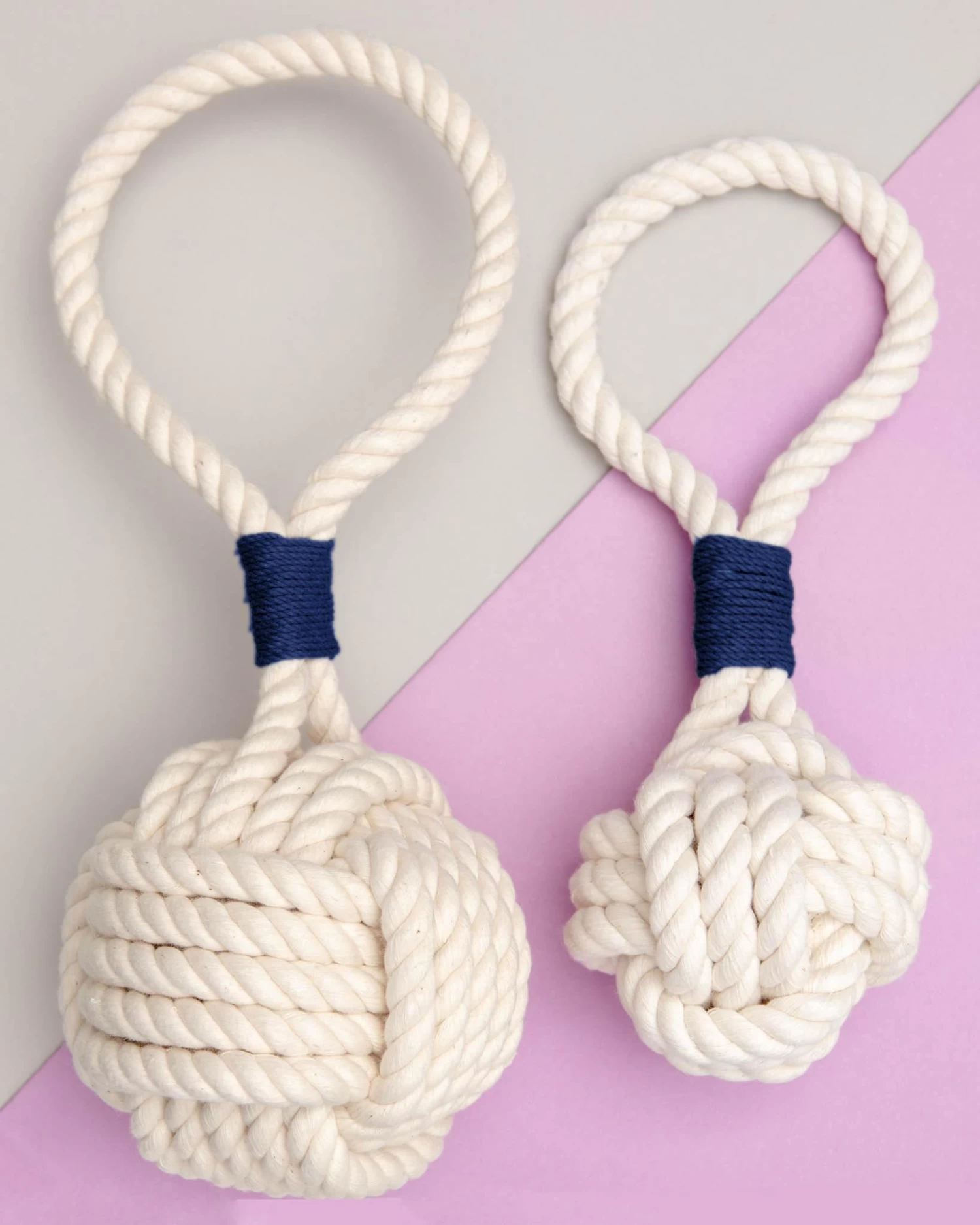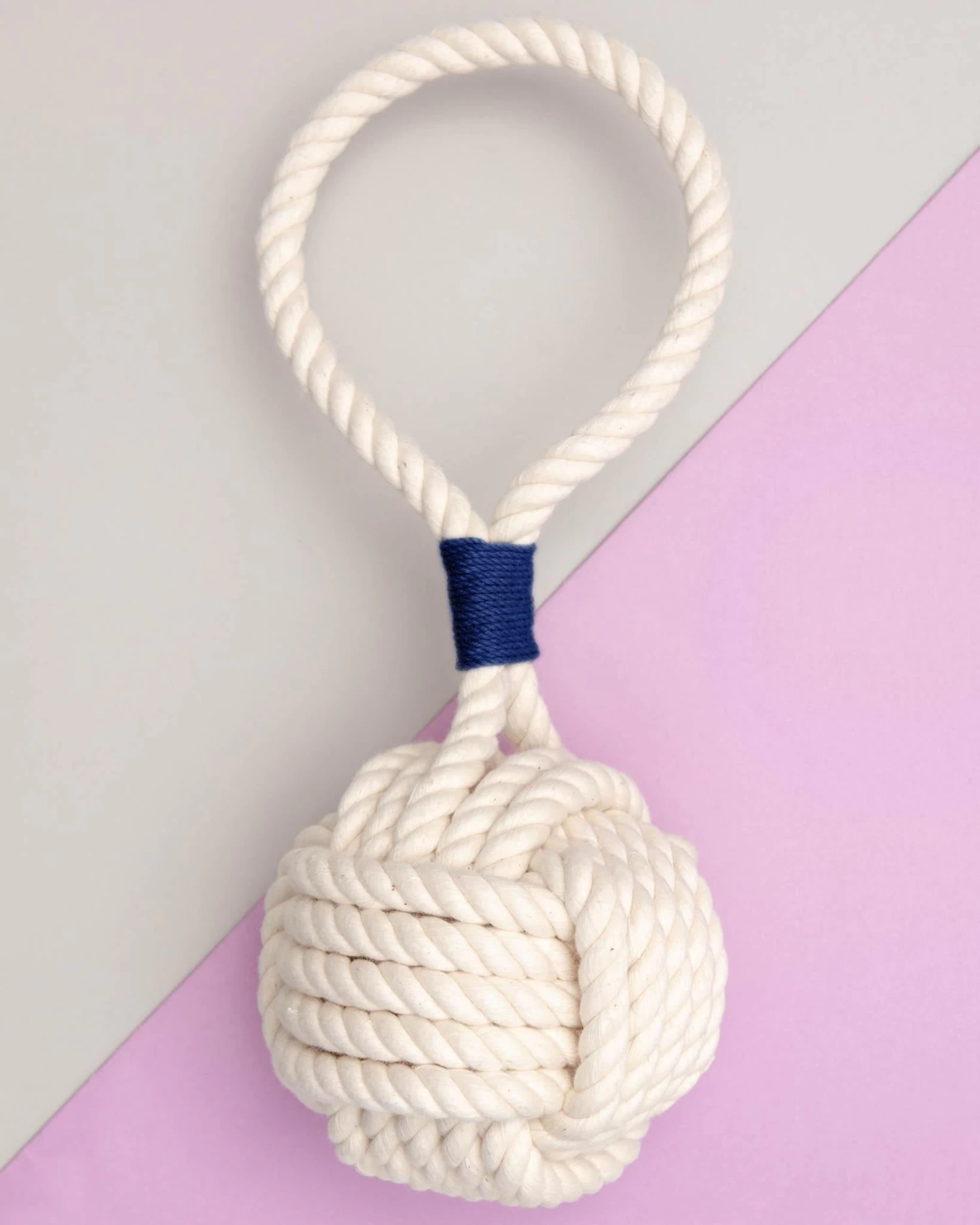MYSTIC KNOTWORK is a family company whose mission is to keep the nautical knotwork tradition alive. Their Monkey Fist Dog Toy is a super durable rope-covered tennis ball for your dog. Throw it, tug it, your dog will love it!