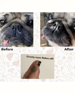- Crusty Nose:Â apply to nose twice daily until healed. Â A little goes a long way! Do not apply in the dogs fold if a smush faced dog. Maintenance: apply three times per week