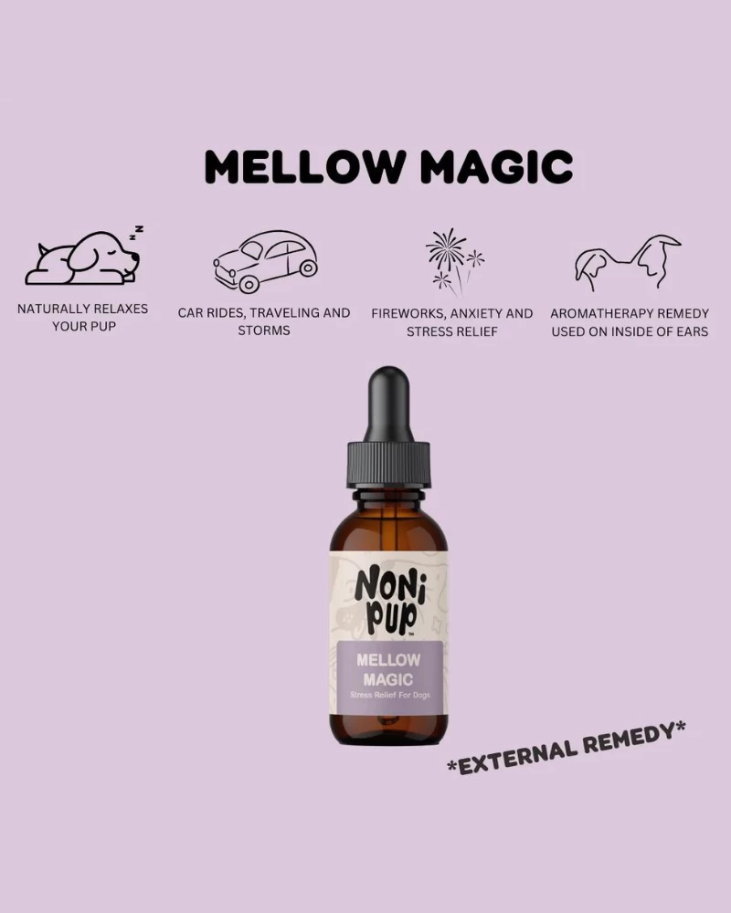 Mellow Magic by NONI PUP is a topical, external serum designed specifically to soothe your dog in any stressful situation. Whether it’s car rides, fireworks, storms, vet visits, or any other nerve-wracking moment, Mellow Magic is your go-to companion.