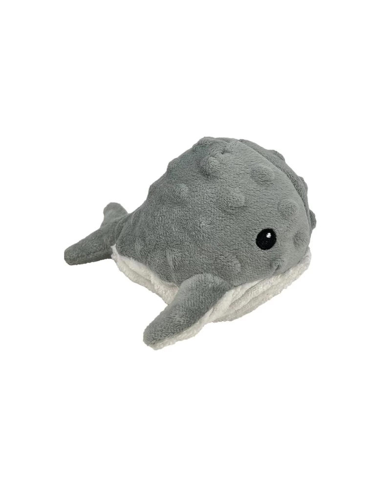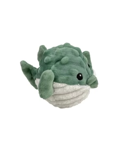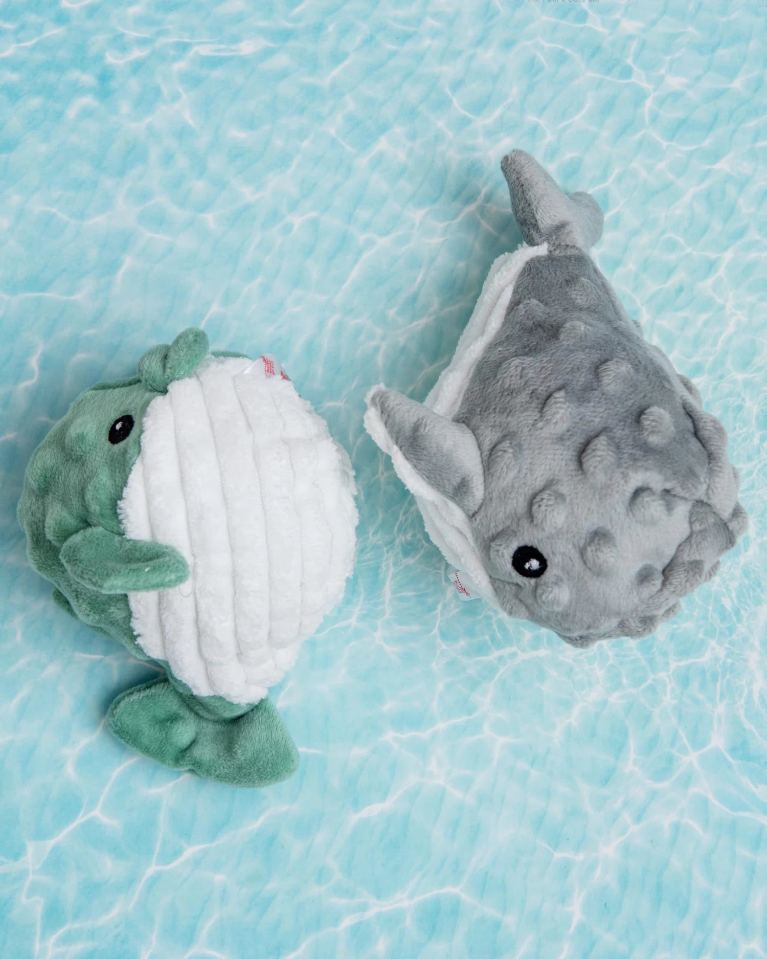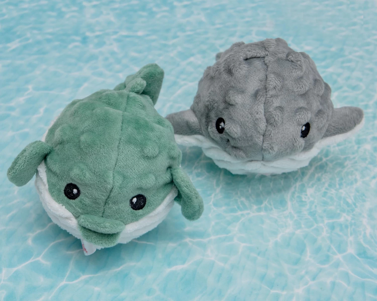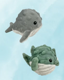 - 4″ wide ball-shaped twin pack dog toy shaped like cute puffer and whale